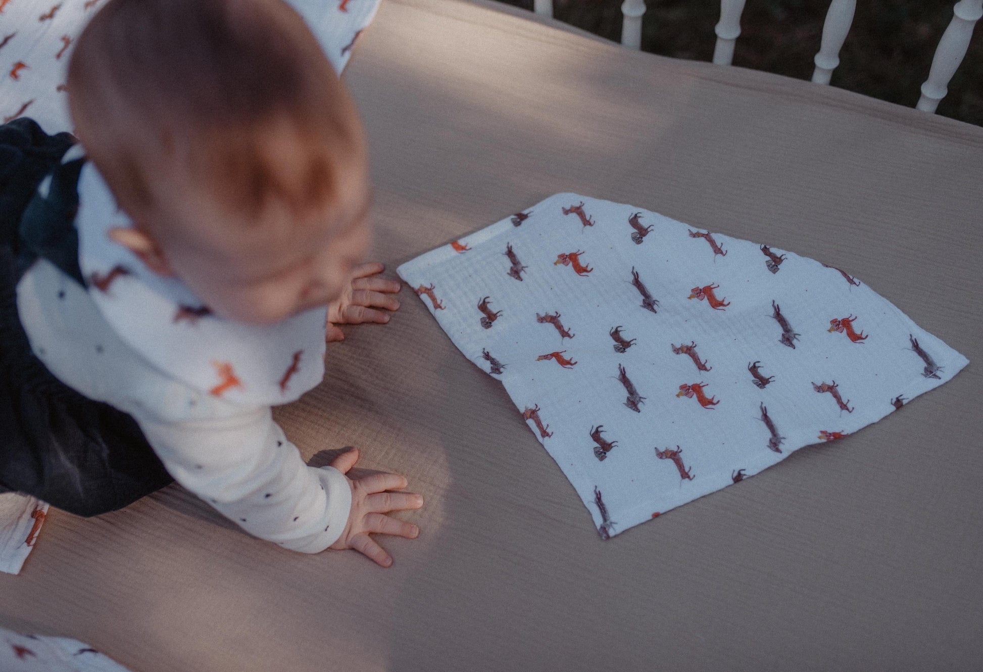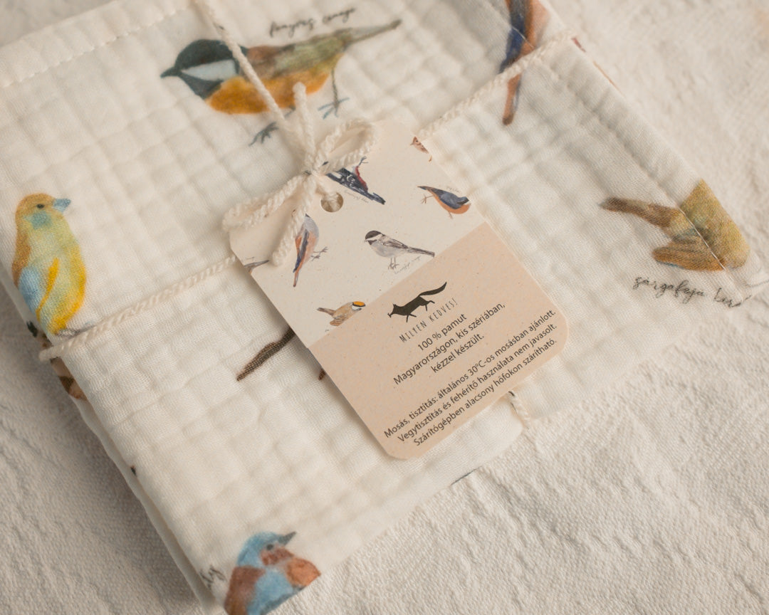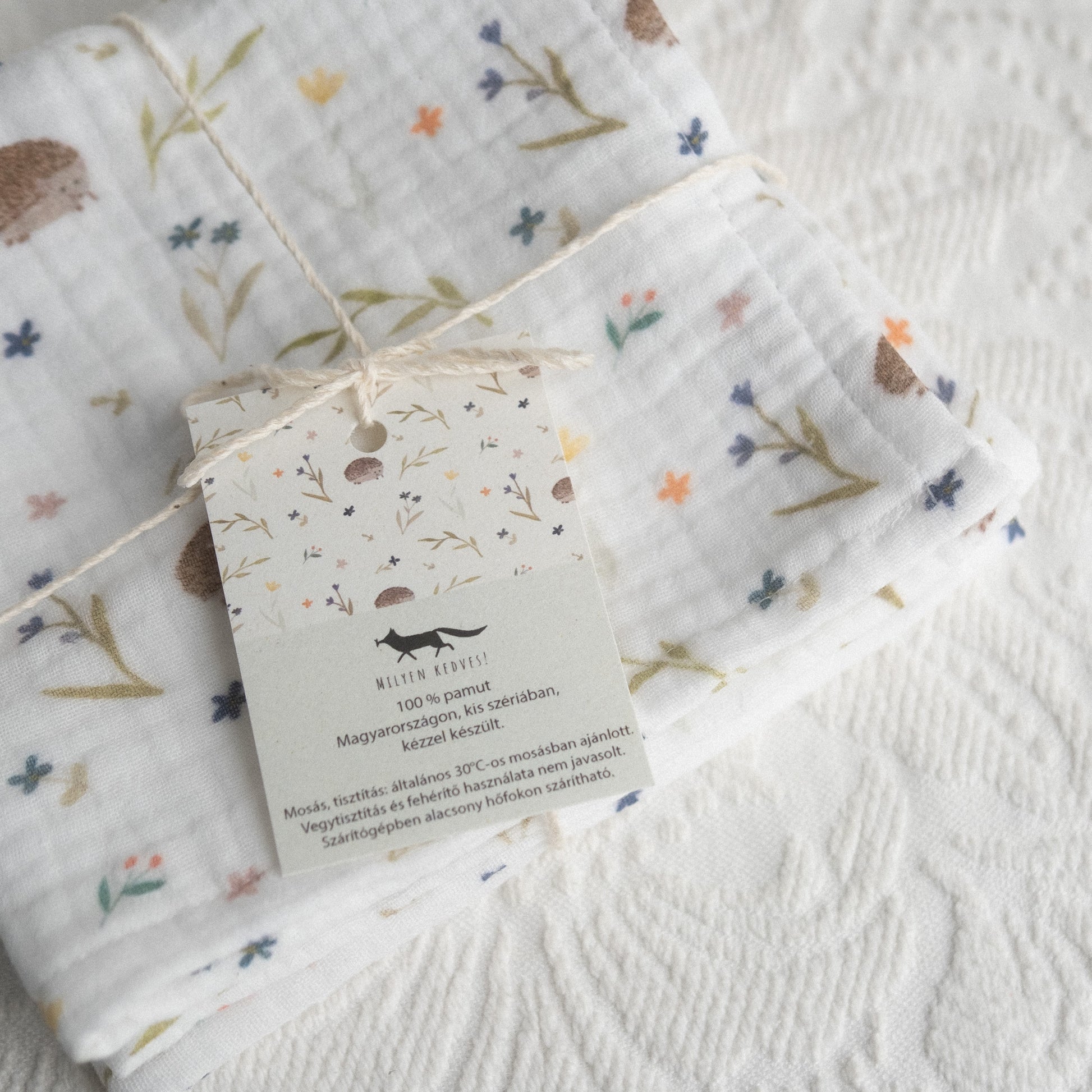 A termékeink 100% organikus pamut muszlinból készülnek, amely rendkívül puha, légáteresztő és érzékeny bababőrre is biztonságos. Minden darabot egyedi, kézzel festett mintáink díszítenek.