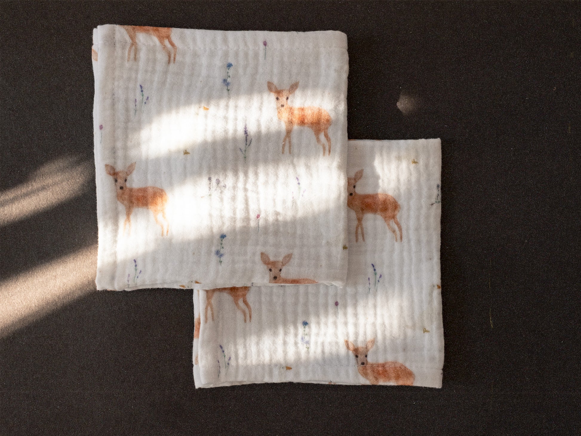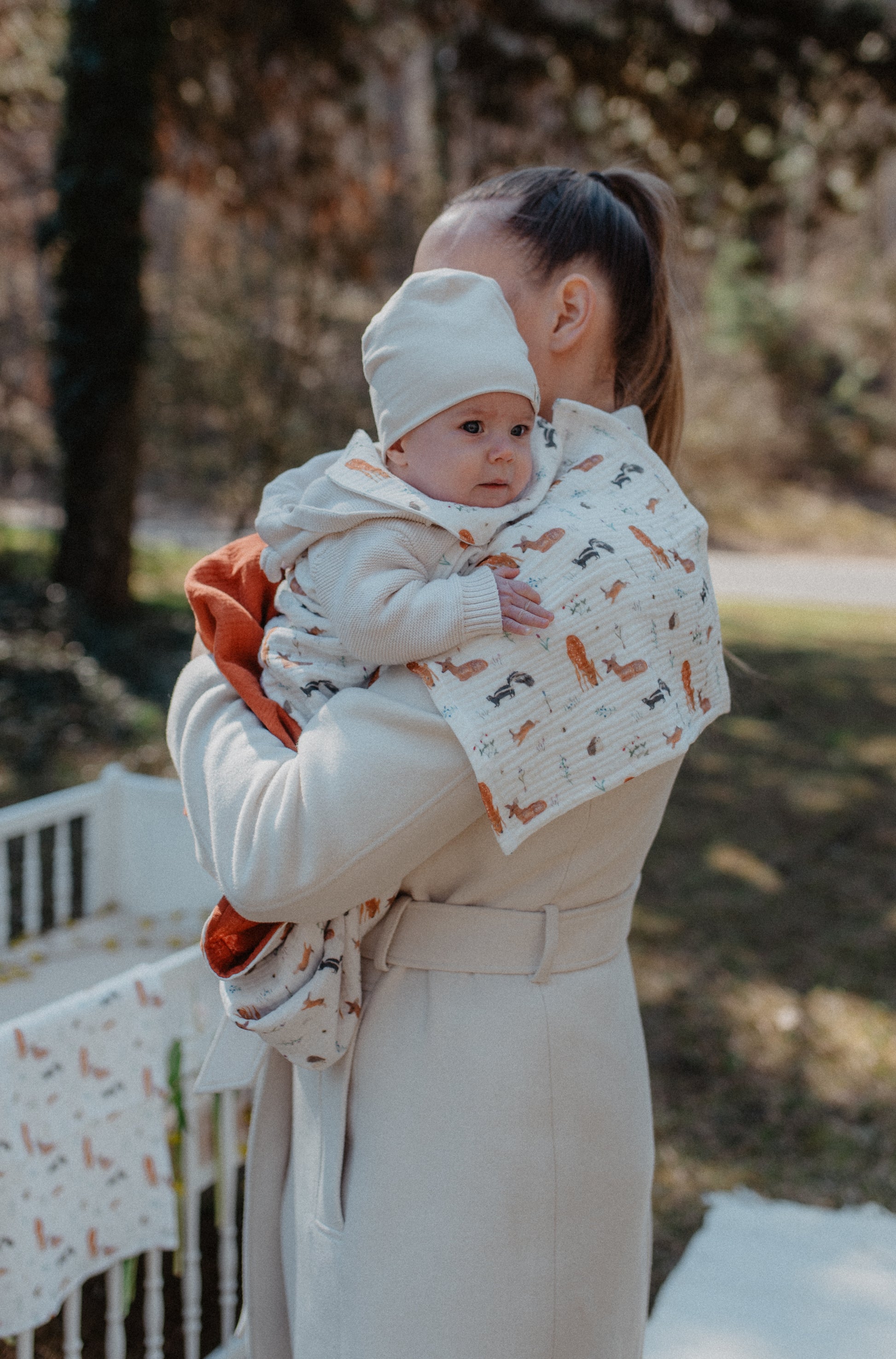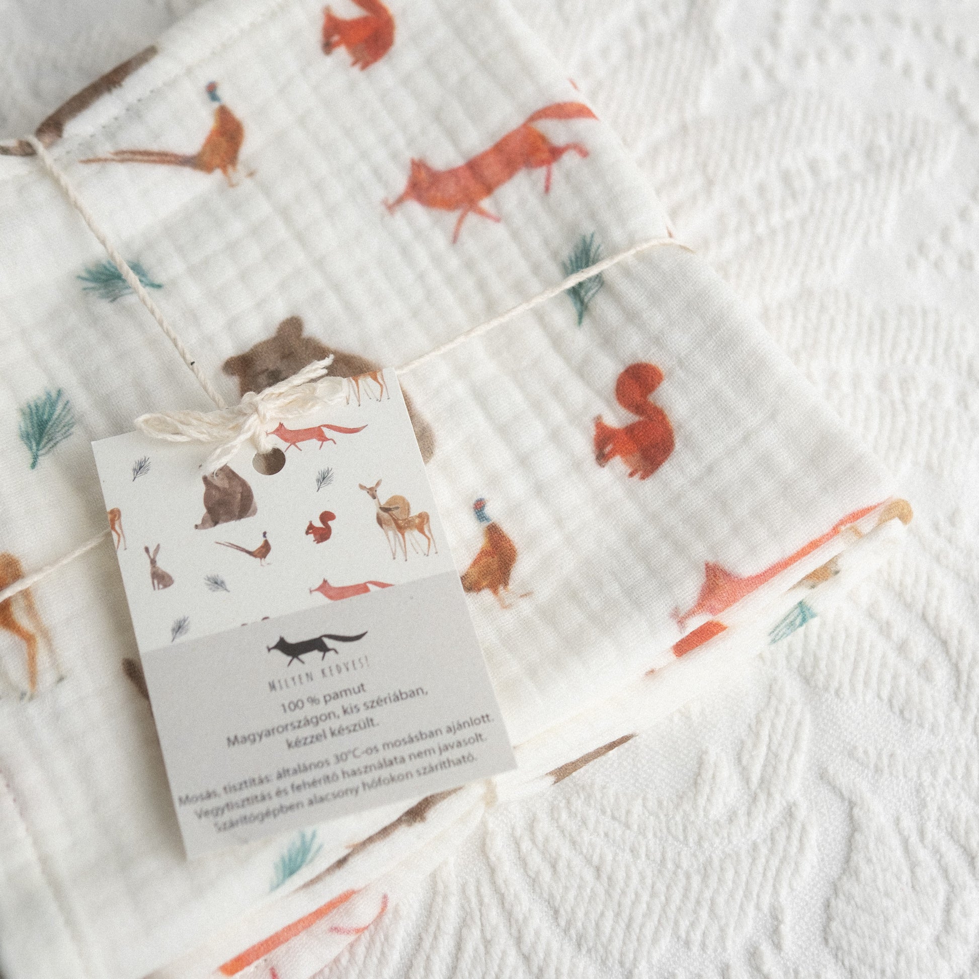 A termékeink 100% organikus pamut muszlinból készülnek, amely rendkívül puha, légáteresztő és érzékeny bababőrre is biztonságos. Minden darabot egyedi, kézzel festett mintáink díszítenek.